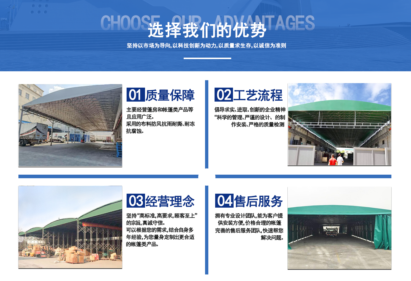 遼寧拓圖鋼結構工程有限公司是一家專業從事推拉篷設計、制作、安裝、使用、維修的綜合性公司。公司主營:電動雨棚、活動雨棚、倉庫雨棚、體育類雨棚、篷房、篷布、帳篷等系列產品的制作與安裝?! ?nbsp; 遼寧拓圖鋼結構工程有限公司堅持以市場為導向,以科技創新為動力,以質量求生存,以誠信為準則,倡導求實、進取、創新的企業精神?!翱茖W的管理、嚴謹的設計、 的制作安裝、嚴格的質量檢測、良好的后期服務成就企業的信譽,為您提供優質服務?! ?nbsp; 遼寧拓圖鋼結構工程有限公司傾力于開發應用三維空間結構與新材料的結合,將廣告藝術視覺表現形式與張力膜材科學的結合,推出多彩推拉蓬,依靠先進的科學技術,將推拉蓬建筑表現形式無限延伸,立志走在建筑科學的前沿,引導建筑時尚潮流,我們的目標是使推拉蓬建筑在中國發展壯大?! ?nbsp; 遼寧拓圖鋼結構工程有限公司憑著極強的事業熱情和豐富的專業經驗以“勤勉進取、銳意創新、至誠至信”的精神使公司得到迅速健康發展,業務范圍遍及全國??茖W的管理、嚴謹的設計、高標準的制作安裝流程,嚴格把控產品質量,熱誠的售后服務是企業競爭力的源泉。    遼寧拓圖鋼結構工程有限公司人愿以最誠摯的態度,歡迎廣大客戶的蒞臨與溝通!愿為市場提供優...